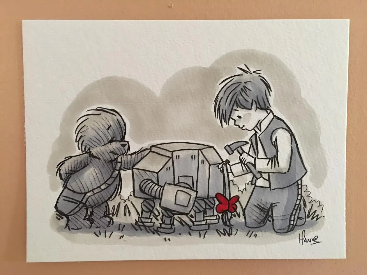 We're not sure what possessed artist James Hance to re-imagine Star Wars in the charming art style of Winnie The Pooh, but the results are too cute to question. Hance has created over a dozen sketches of a Pooh-ified Chewbacca, joined by a young Han Solo as Christoper Robin, a scarf-clad R2-D2 as Piglet, and a sad AT-AT filling in for Eeyore. Hance's initial Etsy sketches are sold out, though he has been adding new hand-drawn copies of the sketches daily. You can also order color prints and an illustrated book of "Wookiee The Chew" from his official website.