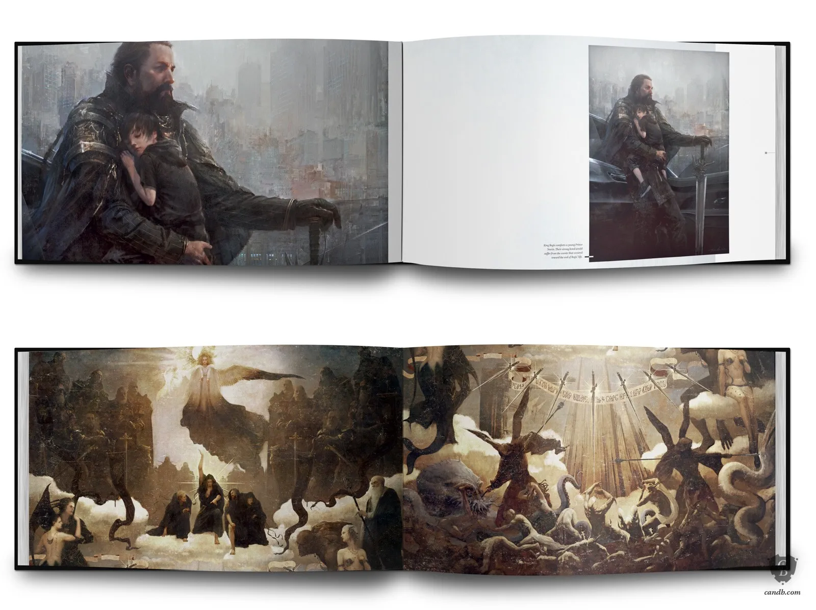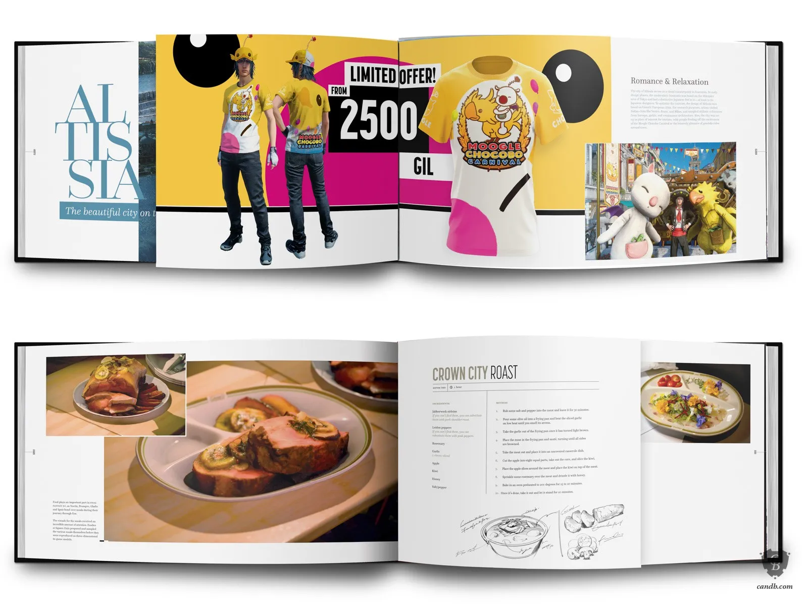 The book also has art from Kingsglaive: Final Fantasy XV, a CGI feature film that takes place during the events of Final Fantasy XV. The massive 220-page book has "never-before-seen" artwork from both the game and the film, and is printed on silk paper. Some of these artworks include character designs, environment sketches, and even the food of Final Fantasy XV.
