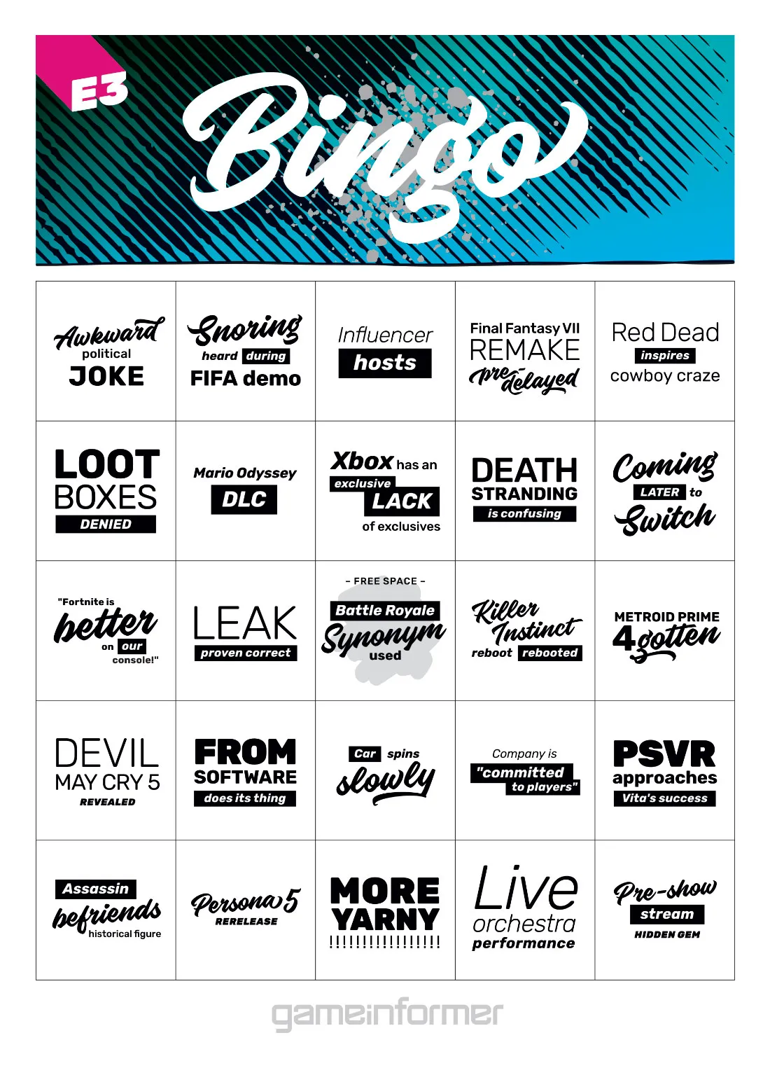 You can also reflect on the passage of time by reviewing E3 Bingos of bygone years, like 2017, 2016, and even the rare 2015.