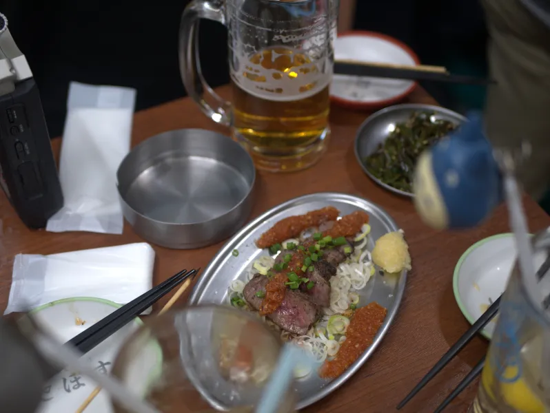 Toyama takes me to Pio City to visit an izakaya – or an all-you-can-eat-and-drink bar. We huddle around our tiny table while older men chain-smoke cigarettes and drink beers. Toyama orders highballs. A mix of beef, lamb, and cooked vegetables comes out for us all to share. The restaurant is loud but in a friendly way. Customers laugh drunkenly, and the staff runs around frantically yelling to the cooks in the back while running out orders. It is, put bluntly, a perfect place to come and get drunk with friends, filling your stomach with as much alcohol and grease as your body can handle.