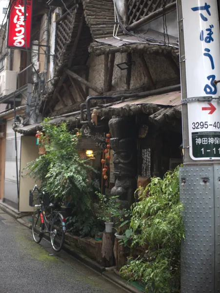 Yamaoka is taking me through Jinbōchō's alleys, and if I stop looking up, I can see the area's past holding on. Tucked out of sight of all the new offices around us are old, weird buildings, such as an eel shop Yamaoka and Toyama used to frequent. There's also Sabouru, a tiki-themed cafe that stands out like a sore thumb even compared to everything else in this alley time has seemingly forgotten. Small parts of Jinbōchō's disorderly past hold on. Even though these days he's one of the most well-known video game composers of all time, not to mention writing soundtracks for massive Netflix series such as Cyberpunk: Edgerunners, Yamaoka seems to do the same. When I asked him to take me somewhere that inspires him, he took me to walk the same old streets he did nearly 30 years ago before becoming a name.