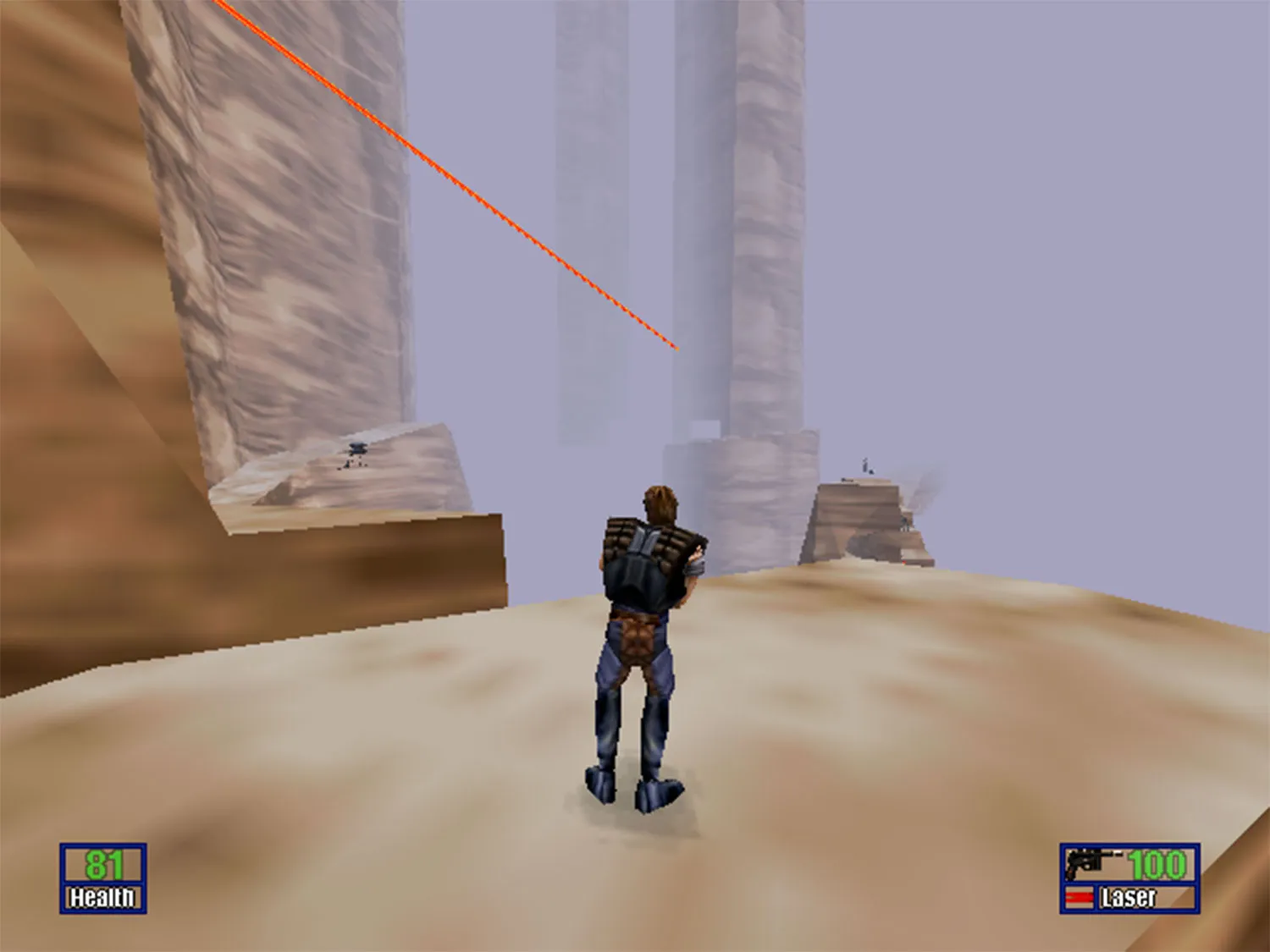 The earliest version of the game wasn’t a Star Wars game. After working on the Super Star Wars action/platformers and the TIE Fighter and X-Wing flight games, Knoles wanted to do something different. “We decided to take a break from Star Wars, so we started kicking around this idea of a western with this new machine we heard Nintendo was making,” Knoles says. His team was experimenting with the new world of 3D graphics, specifically trying to place a player on a moving train.