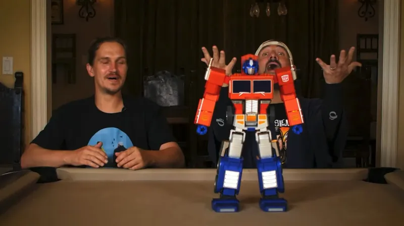The final toy shown was presented by Kevin Smith and Jason Mewes. Sitting in front of them was a sizable Optimus Prime in vehicle form. When Jason Mewes said "convert," Prime began transforming into robot form. The familiar transformation sound rang out as Optimus Prime quickly unfolded and stood on his own! It was an impressive thing to see, and both the robot and vehicle forms look fairly good, though some changes had to made to simplify the transformation process for automation.