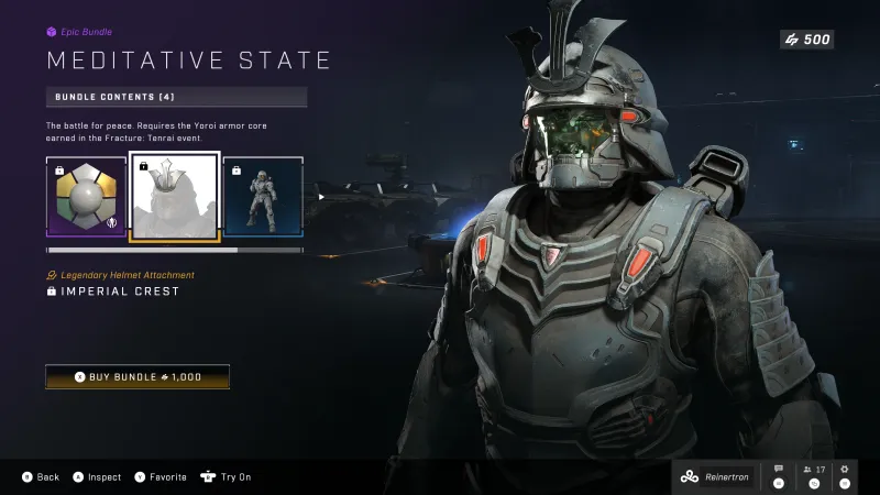 The more interesting offering this week is the Meditative State bundle, with the standout piece being the Imperial Crest helmet attachment for the Yoroi armor core earned in the Fracture: Tenrai event. This set also offers a cool coloring option called Expressive Soul which adds samurai-like highlights to the armor in gold and green. The bundle is rounded out with a triumphant stance called Mirror Tale, and an epic charm called Black Opal. This pack is 1,000 credits.
