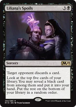 With Liliana's Spoils, you get the best of both worlds. Not only will your opponent lose a card, but you get to dig into your deck to find whatever's needed at the moment. A big creature, a removal spell, or even Liliana herself! Unlike many other hand destruction spells, Spoils is still useful during a topdeck stalemate situation.