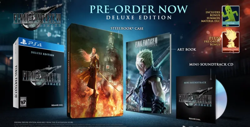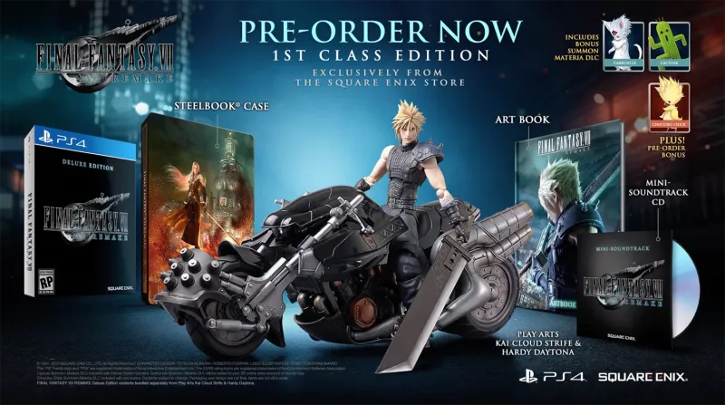 No pricing information for either edition is available yet, but here's what you get for each one. The Deluxe Edition includes a steelbook case, a mini-soundtrack, and two DLC summons (Cactaur, Chocobo Chick). Those who upgrade to the 1st Class Edition will get all of that plus one more summon and, most notably, a figure of Cloud and his bike. The 1st Class Edition can only be ordered from Square Enix's online store.