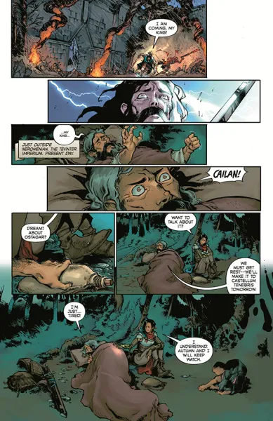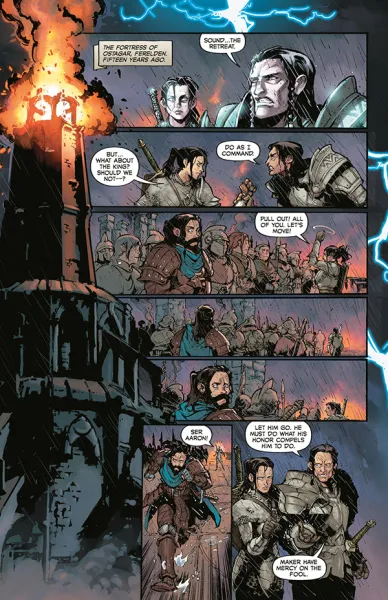 The issue continues with Ser Aaron waking up from his dream about the horrific turn of events that kickstarted Origins and brings us back into the present-day with Fenris, Marius, Francesca, and Tessa at camp preparing for the assault ahead against the Castellum Tenebris fortress in Tevinter: