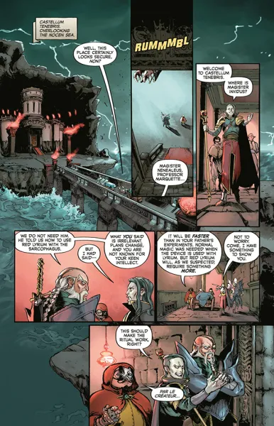 The story continues with a focus on Castellum Tenebris, the fortress that is at the center of this new story. Once more, this comic continues to offer a closer look at Tevinter society with Magisters once more plotting for more power through the harnessing of red lyrium (you can learn more about that here). As evil as ever, which is not the case with all Magisters as evident through Dorian Pavus's (Inquisition) continued storyline in the Tevinter Nights anthology alongside Maeveris Tilani, the plot for control of Thedas continues as Fenris and co. race to put a stop to these nefarious plans: