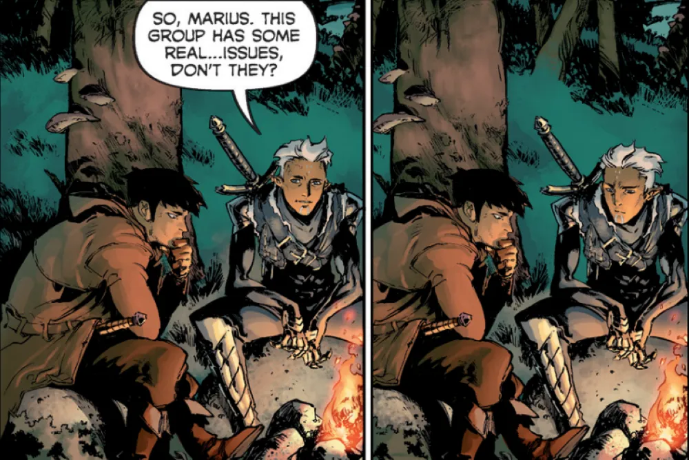 In the third panel seen above, the group dynamic continues to shift from the events previously seen in Blue Wraith, with a Fenris that is more in line with how he eventually became towards the end of Dragon Age 2: more rooted in himself, confident in his identity as a free man (no longer a slave), and more open to letting people in. Some had an issue with how this character was portrayed in Blue Wraith because it heavily implied that he was abandoned by the friends he made in Kirkwall. This creative turn hit especially hard for those that romanced him because his romance is arguably the hardest but also incredibly rewarding for how much he opens up.