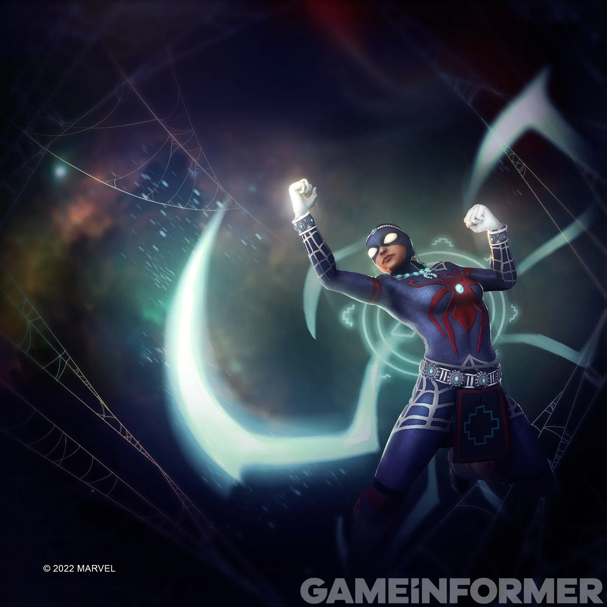 "We've never had a Spider-Verse Protector character, and so playing with the idea of [Na'ashjeii Asdzáá] being a benevolent, protector to humanity, we wanted Spider-Weaver to be this unique character," he says. "The gameplay mechanics are going to be about her being able to heal and buff and put defensive barriers on the team, but also reduce incoming attacks. She basically destroys enemy teams' accuracy, so they're going to be missing. There's a novel mechanic there where people will just not be able to hit her and her team, and then the rest of her team are going to be able to do damage and apply a lot of debuffs that are going to be very sticky in Cosmic Crucible to the enemy teams."