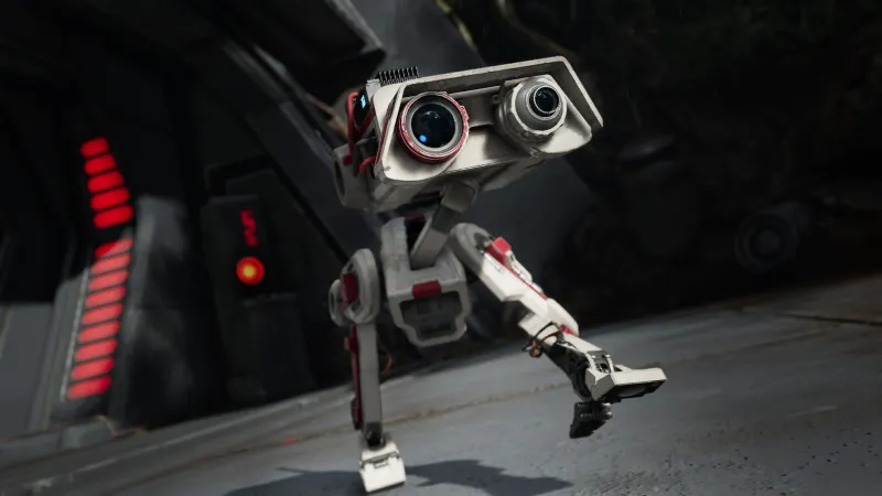 One of the environmental interactions arrives early within a darkened Imperial structure. Cal and BD come across a large device that has lost its power. If the device were powered up, it could slide along a path on the floor, potentially revealing a new area. Cal leaps up and grabs onto the top of the metal device, shimmying along it quickly to a position where BD can leap on a panel to give it a shock of life. This ability came from a workbench Cal found nearby that allowed him to install an overcharge upgrade to BD, which is also shown cosmetically on the droid. The player tells BD when to turn on the device, which Asmussen says is a little gameplay interaction that goes a long way in creating timed puzzles and different gameplay moments.