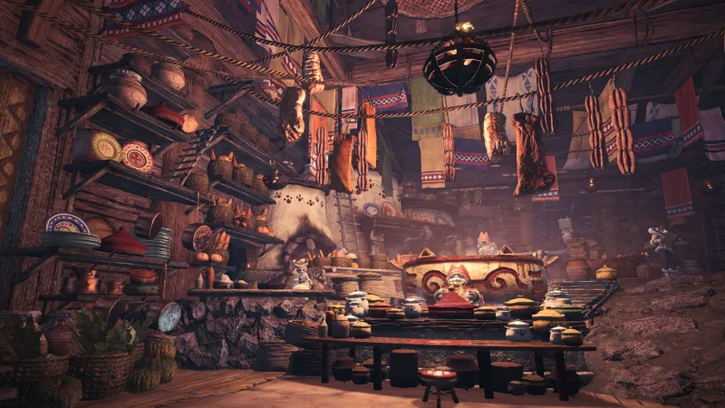 Putting the Meowscular Chef in this cozy new environment felt a little weird, so they designed a new character based on Russian nesting dolls: The Grammeowster Chef. Unlike the gung-ho attitude that Astera’s chef brings, this new Palico cook is a soothing presence, with more relaxing cooking animations than those of her protégé. Her food looks great, too. “We put a lot of thought and effort into making you be able to taste the food when you see it,” Fujioka says. “For example, the beef stew and the melted cheese. It’s something that you know there’s a lot of good taste behind it. We wanted something different from just a slab of meat in the Chef’s canteen.”