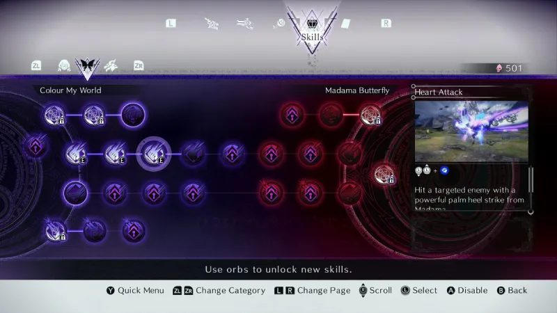 In a convenient shift for the series, Bayonetta 3 features traditional skill trees. Gone are the days when players had to lug Halos around until they found a portal to Rodin’s bar; skill trees are accessible through the menu, meaning you can upgrade Bayonetta whenever you want. Spending Orbs, another new collectible earned during the post-combat encounter report card, unlocks new moves. Demons have their own ability trees too, expanding their capabilities for Demon Masquerade/Slave and creating a plethora of potential combat combinations.