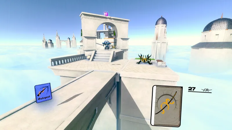To cut ambiguity, they’ll need to remove the Elevate card, telling the player instead they need to jump to the left (not double jump, mind you) and then dash forward through the next set of enemies. However, that dash also presents its own set of issues. Two enemies stand on opposite sides of a small gap, and by the time you reach them, you have two Godspeed cards. The enemies are placed so the player has to dash through both, but it’s unclear if they must dash twice to kill them or if one will do the trick.