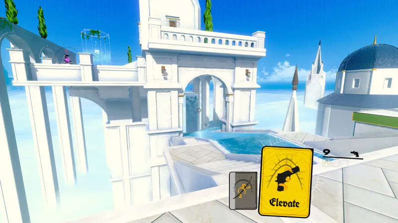 In this iteration, the level begins with a Godspeed card and an enemy standing to the right. It’s telling the player to grab the card, which grants a dash forward, before killing the enemy, which then drops an Elevate card, giving a double jump. But as Piccollo points out, there’s nothing on which to use that Elevate card. Neon White, he says, is all about using what you immediately have.