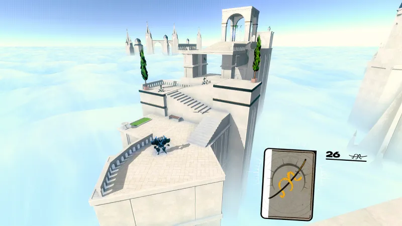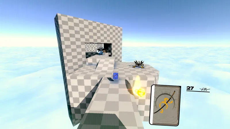 Eight months later, and the two cards at the beginning are spaced further apart to allow the player more reaction time. The gap is much longer to make it clear you need two dashes to get both enemies. The enemy atop the staircase now shoots down at you, so you can see its location. Across the board, Smackdown is now giving the player more information, making it easier to navigate. It’s becoming unambiguous. The ending is falling into place, but the pathing to the optional gift is unclear. It’s reachable by jumping atop the columns surrounding the back of the level. But where the player needs to do that isn’t, as Esposito calls it, inviting. It looks like a place the player isn’t meant to reach.