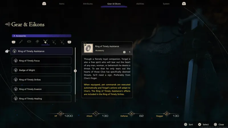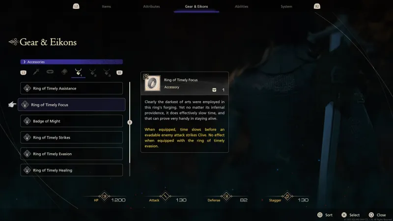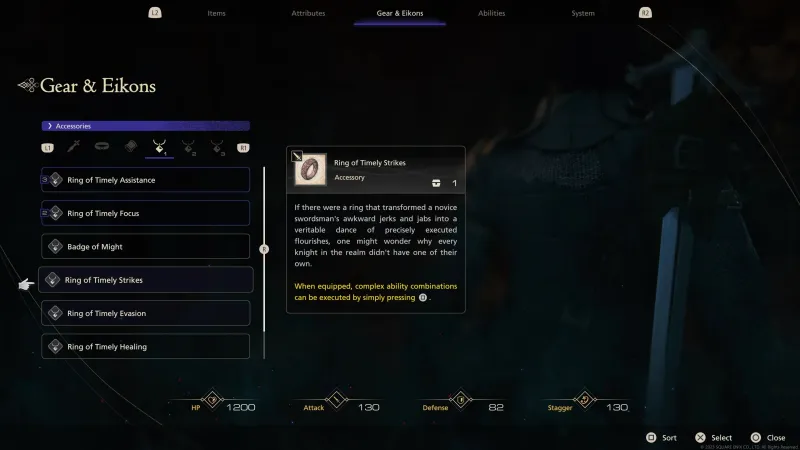 Ring of Timely Strikes: Combat in FFXVI revolves around mixing and matching various moves to create combos. With this ring equipped, you can just press Square and Clive will perform the combos automatically. It essentially allows you to complete combat scenarios using one button.