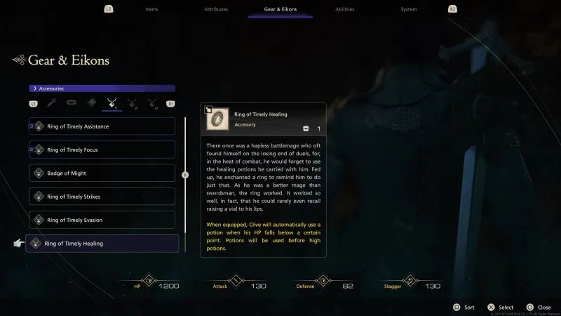 Ring of Timely Healing: When Clive’s HP drops to a certain point, he will automatically use a potion to heal (so long as you still have potions).
