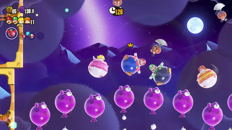 Maw-Maw Mouthful culminates with one of the most interesting Wonder Effects: The player characters transform into Goombas, who Maw-Maws seem to have an insatiable appetite for. Here, you must avoid being eaten by hiding in the trees and then working your way towards the Wonder Seed by riding various platforms that are accessible to you as a Goomba who can’t jump. The next Wonder Effect isn’t any less strange, as I play Bloomps of the Desert Skies, where Mario transforms into Balloon Mario and must navigate a gauntlet of enemies and obstacles on his way to the Wonder Seed.