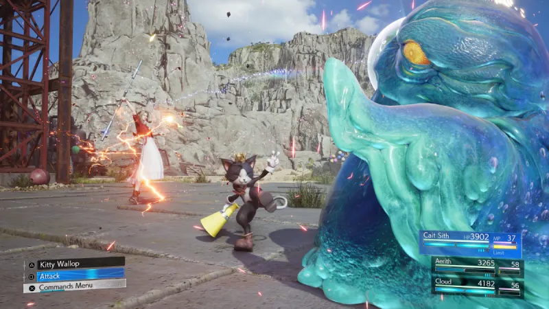 On the way to the merc, I get a sense of the battle styles of the two new party members. Red XIII is agile and quick and uses the guard mechanic to fill a meter for his new Vengeance Mode, which increases his speed and attack power. Meanwhile, Cait Sith brings the most unique combat style yet to the Remake series, including moves that play off the luck mechanic from the original game. Cait Sith can fight separately or summon a Moogle to ride around on. When on the Moogle, Cait Sith has an entirely separate moveset than when he’s solo, such as a Moogle Mine attack, where bombs spread across the battlefield. He can also dismount and use his solo moves, while Moogle will continue attacking as controlled by A.I. Moogle has a separate HP meter, and if he takes too much damage, he’ll vanish until Cait Sith summons him again.