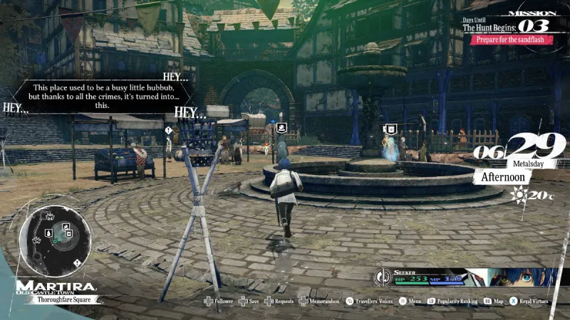The first follow-up save file takes me to a town called Martira about 8 to 10 hours into the story. This save focuses more on activities you can do around town without much consideration for the overarching story. As such, it involves taking on sidequests from the townsfolk. One man needs a pigeon parcel by a certain date, while another wants you to take down a nearby magic-wielding monster. Since Metaphor retains a calendar system similar to that of the one from the Persona franchise, you budget your spare time through activities like completing sidequests, boosting your own stats, or improving your relationships with your followers.