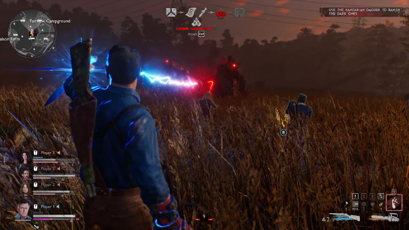 At this point, things change drastically in terms of the game state. The survivors must out-race an encroaching circle on the map (similar to how the action is forced in many modern battle royales) and head to the marked Dark One spawn. This fight is the most intense, with the Dark Ones themselves fighting back, hordes of A.I. Deadites, and the Demon bringing out their best monsters for one final battle. It’s a harrowing confrontation, and a few of my friends get knocked down, but I keep the focus on the Dark Ones themselves, as once their health bar is depleted, you don’t need to worry about the rest of the undead menace. While things get pretty dicey near the end, a bit of sidestepping and juking brings us a big win for the good guys.