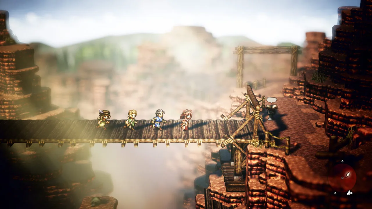 Coming off the Bravely series on 3DS, Acquire and Square Enix wanted to use current technology to craft a new role-playing game with a retro aesthetic to appeal to players now in their 30s who grew up playing 8- and 16-bit RPGs. The team felt that simply going with strict pixel art wasn’t exciting enough and wouldn’t make the game immediately stand out, so they came up with a hybrid, dreamlike style. “We tried different things, and originally we did try to put everything in pixel-style art,” says producer Masashi Takahashi. “But at the end of the day, compared to what we were thinking of, it felt fake and low-quality.”