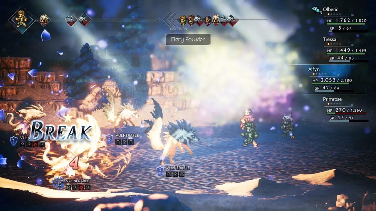 Battles play out in a standard turn-based manner, but with several additional wrinkles. Being able to exploit weaknesses to break enemies, while also saving up boost to supercharge attacks and abilities leads to more complex battles than simply attacking in turn. My strategy of saving Olberic’s boost for three turns, then buffing him with Primrose before unleashing a fully charged sword attack on a broken opponent proves deadly effective. However, the system encourages informed experimentation, and this strategy is hardly the only successful combination I uncover. In another instance, I stagger the opponent using Tressa’s primary attack, then use Alfyn’s apothecary concoction skills to exploit the enemy’s elemental weakness and turn it into dust.