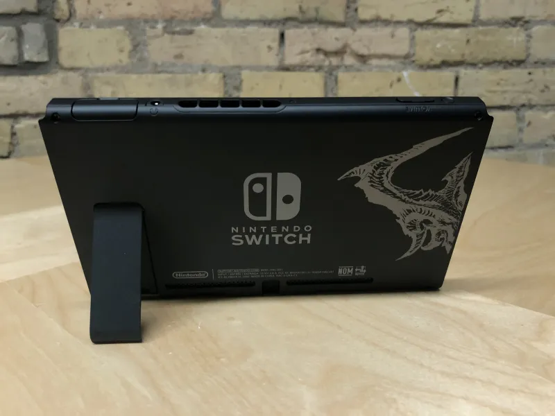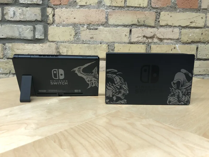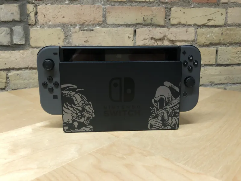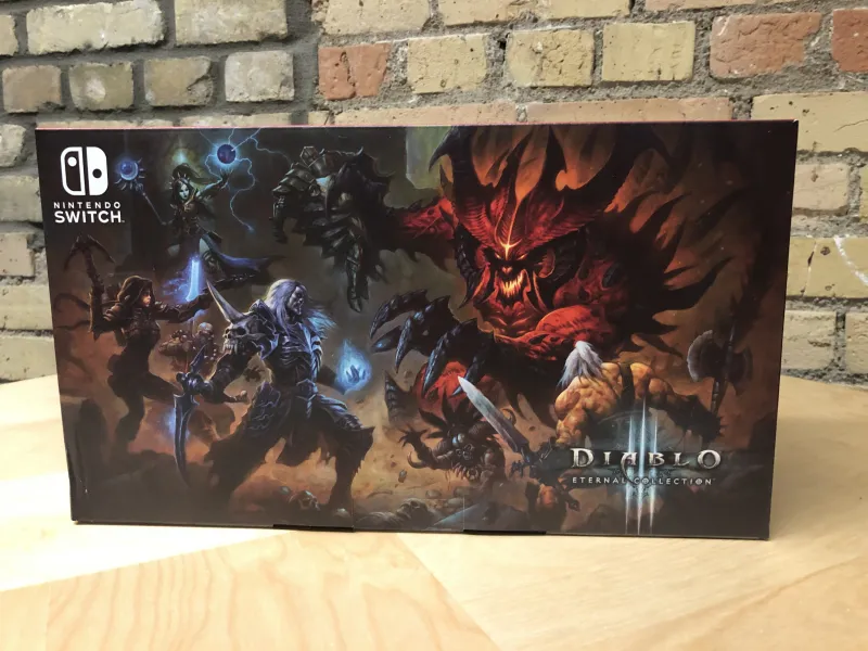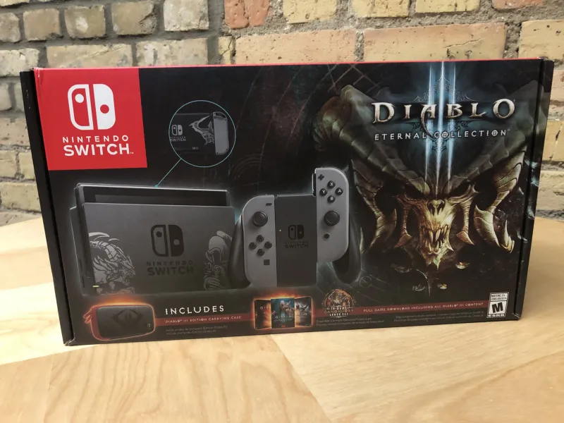 We were sent the Nintendo Switch Diablo III Bundle, so we decided to snap some photos and show off how it looks. The carrying case is nice, and the art on the dock is good looking. However, having the art on the Switch unit itself relegated to the back is a weird choice. It's also disappointing to have the bundle come with the standard charcoal Joy-Cons and not have any special design on the Joy-Con Grip.