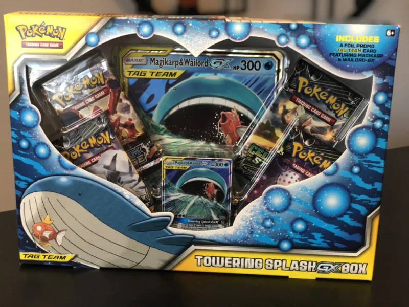 The new expansion introduces more than 180 new cards, including 6 Tag Team pairings. The Pokémon Company sent us a ton of booster packs, both themed decks (Relentless Flame starring Charizard and Torrential Cannon starring Blastoise), and the Towering Splash GX box featuring a special Magikarp & Wailord GX Tag Team card.