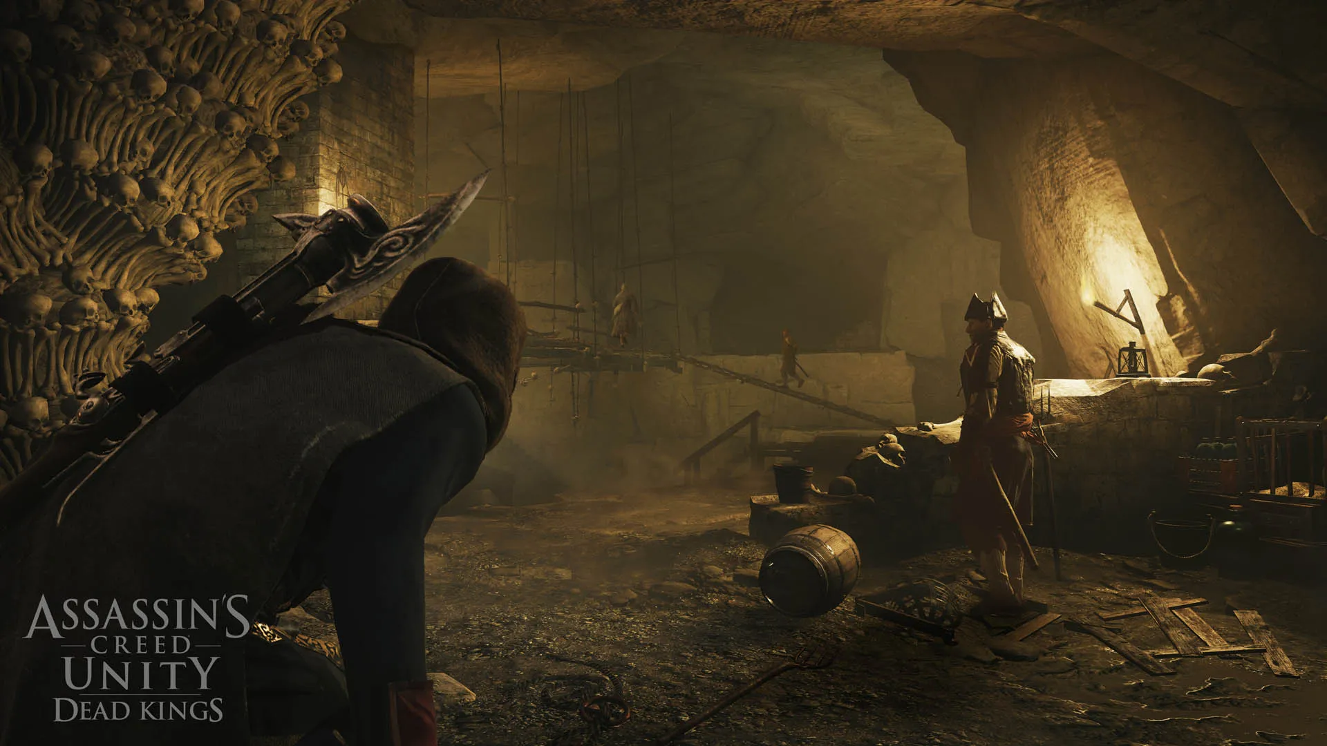 The biggest DLC addition included in the season pass is entitled Dead Kings, and takes Arno to Saint Denis, a French city outside of Paris. Dead Kings takes place after the events Unity, and features what Creative Director Alex Amancio says is the darkest story Ubisoft has ever told in the Assassin's Creed series. Thanks to its underground labyrinth of crypts, Saint Denis will feature a host of puzzles, as well as treasure hunts, murder mysteries, and other missions. You'll also be unlocking new outfits, skills, and weapons, including the Guillotine gun, which fires explosive rounds.