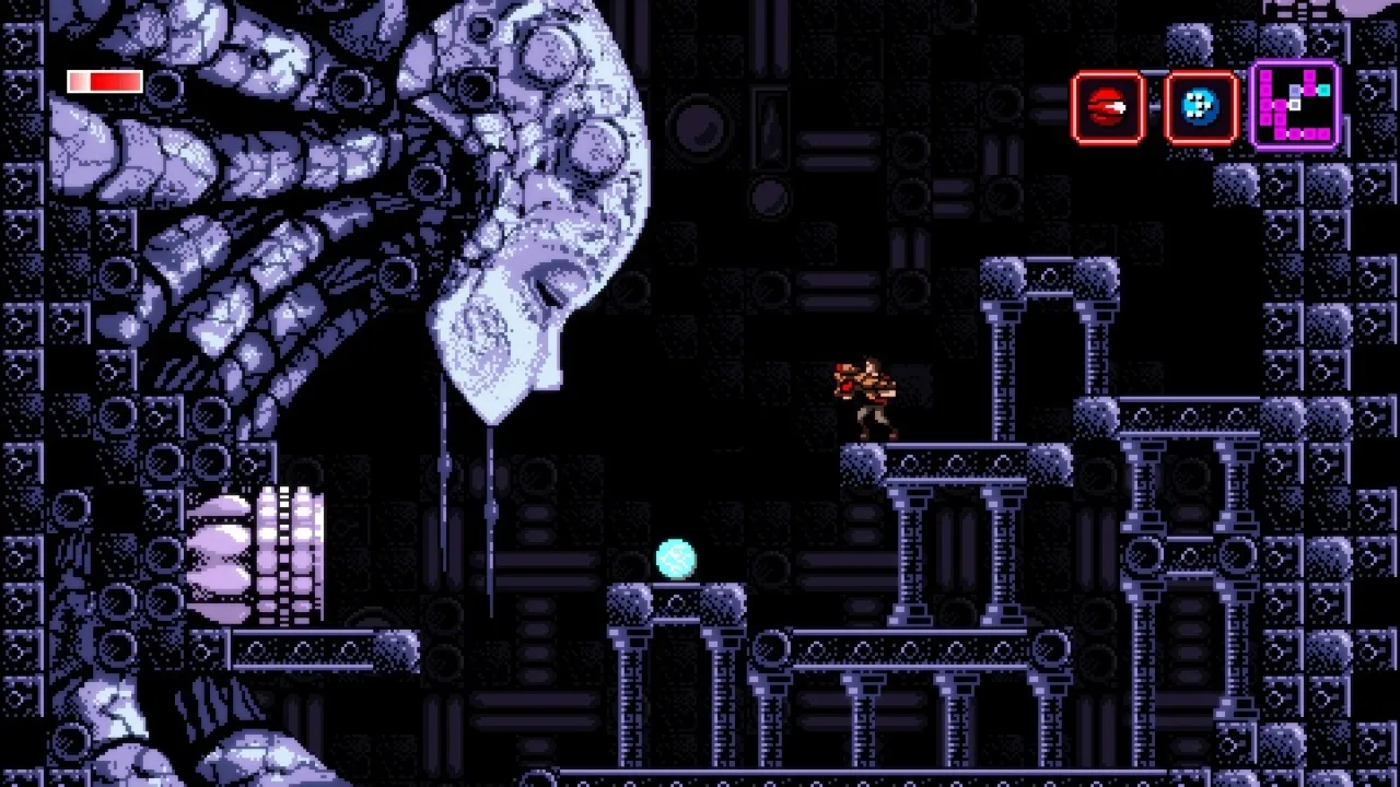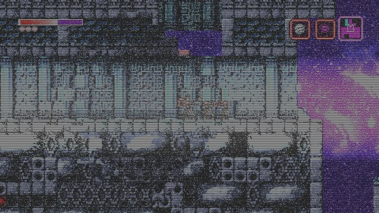 Straightforward hallways and vertical shafts are mixed in with puzzles and gates that prevent you from passing until you return with a new ability. Axiom Verge has no waypoints or dots to remind you of an out-of-reach power-up. I wish I would have taken more notes along the way; returning to nab power-ups or figure out where to go next can get confusing and frustrating. However, I don’t necessarily want to stop the flow of gameplay to sketch out secrets on graph paper every 10 minutes.