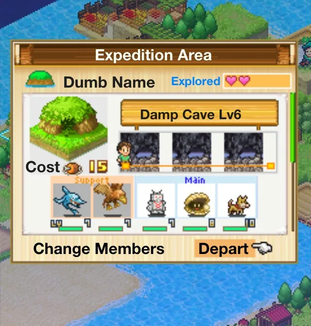 You begin on a small island surrounded by untamed frontier. After choosing one of three starter allies (I picked the dog), you and your animal companion blaze a trail through the regions and fight against the local wildlife. You don’t control your character directly during exploration; like Dungeon Village, the areas are condensed into a strip near the bottom of the screen where the character plods forward slowly and automatically. This structure saps most of the thrill from exploration, especially since you have to delve into the same dungeons multiple times to level up – but Beastie Bay has bigger problems than that.