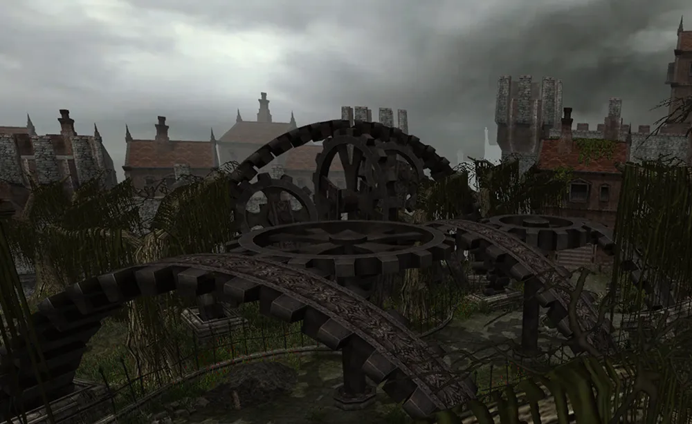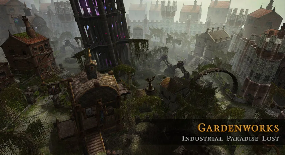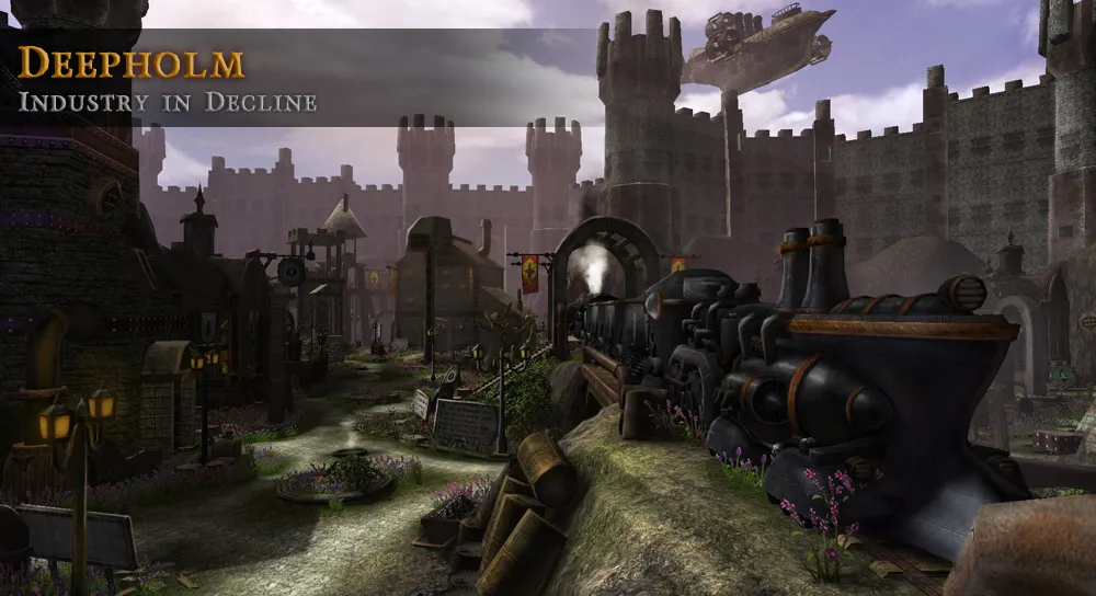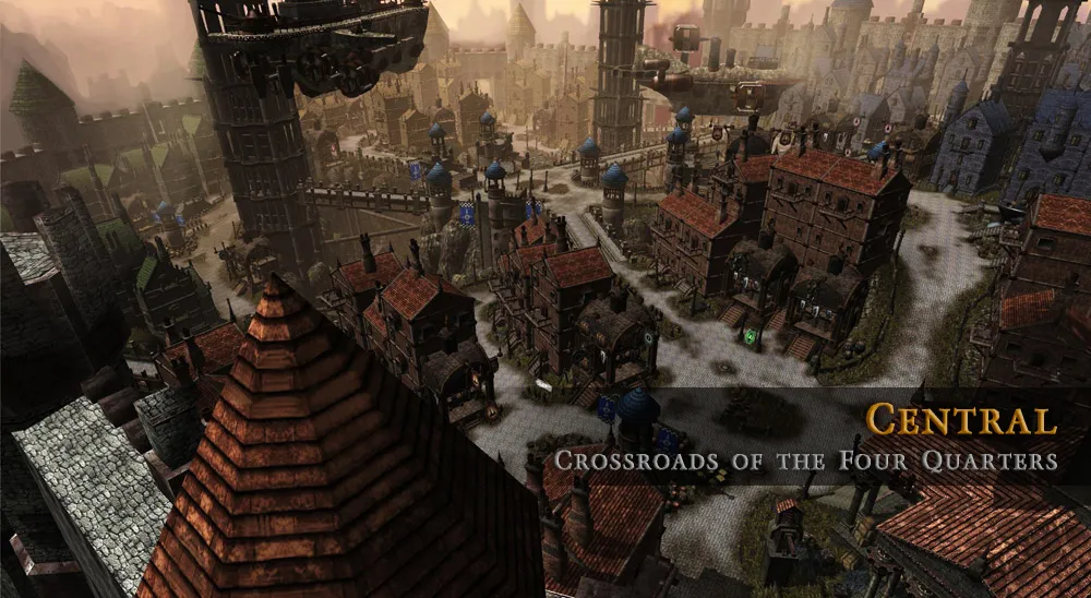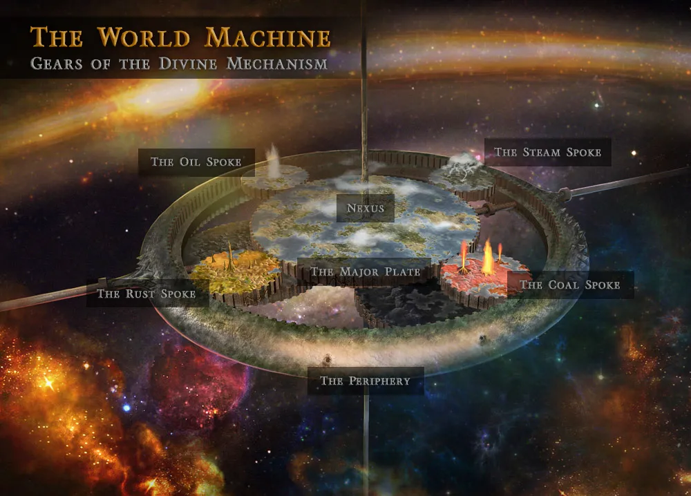 The world of City of Steam is set upon a massive construction known as the World Machine and is made up of numerous interlocking gears, many of which will probably be visited by players at some point. The base game takes place upon the center gear, called the Major Plate. Surrounding the Major Plate are four spokes made up of the elements of the World Machine: steam, coal, rust, and oil. Each of these spokes cause seasonal change, and are realms in their own rights. Surrounding all the gears is the Periphery, a band that binds everything together. This area is full of rugged terrain and dangerous monsters. Foreign gears are speculated to be floating through the void beyond the World Machine, as is as an underworld full of demons. The hub of City of Steam is called Nexus, a giant city in the center of the Major Plate. There, players will accept missions which will take them to various locations with different tasks. Each region has its own history and the lore of the World Machine appears to be incredibly deep.
