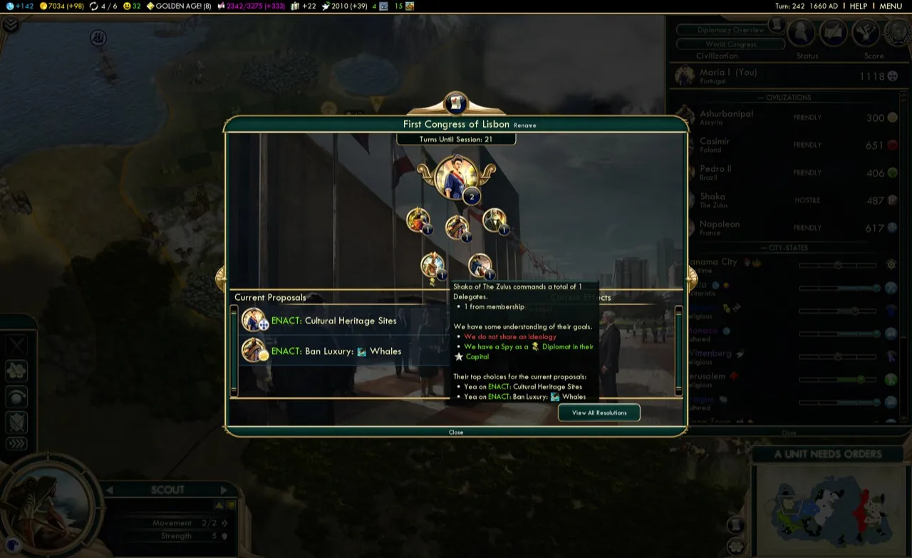 The new factions are more strongly themed than many other civilizations. Portugal must use its powerful Nau super-caravel to quickly explore and generate piles of money, or fall forever behind more generally advantaged civs. Venice has an impossible task ahead of it if forced into expensive wars, as its puppet-state empire runs on money – but its ability to instantly puppet city-states changes the entire face of the game. The Shoshone are my favorite, as their super-scouts and instant land-grab power makes quick expansion a no-brainer. The stable of new leaders is a good injection of variety overall, even if I personally prefer less pigeonholed civs like Poland and Shoshone.
