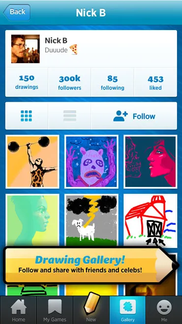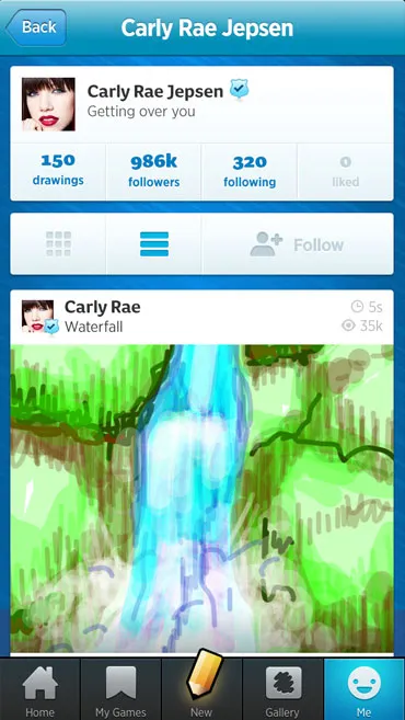 The new social functions are interesting. Your home page is now an Instagram-style feed which shows off artwork done by your friends, other players, and celebrities like Carly Rae Jepsen. Seeing the high-quality and elaborate artwork that skilled players can accomplish with all of the tools unlocked in the game is great. You can also easily share your pictures to your own "My Drawing" gallery, or quickly post them to Facebook or Twitter.