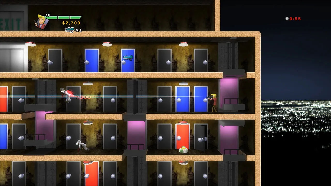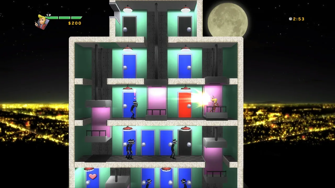 Elevator Action Deluxe is looking to emulate most of the fundamentals of that original game, but update everything from gameplay to graphics. The new version includes local multiplayer for up to four players, HD graphics, and unlockable "secret documents," which amount to old Taito game pamphlets. In addition, you'll be able to play both the new game and the complete version of the original game. We'll let you look at the screenshots below and figure out which is which.