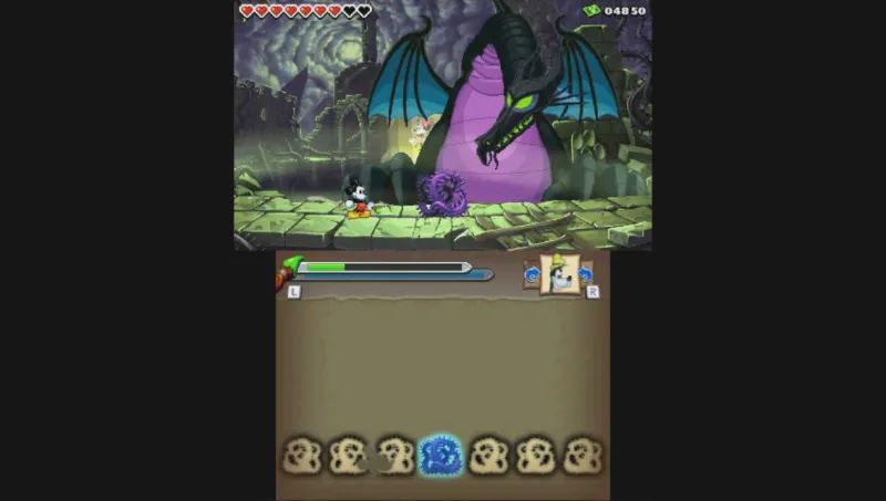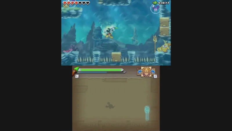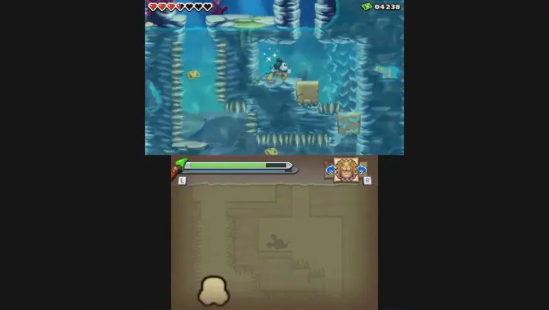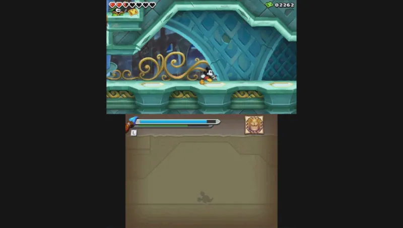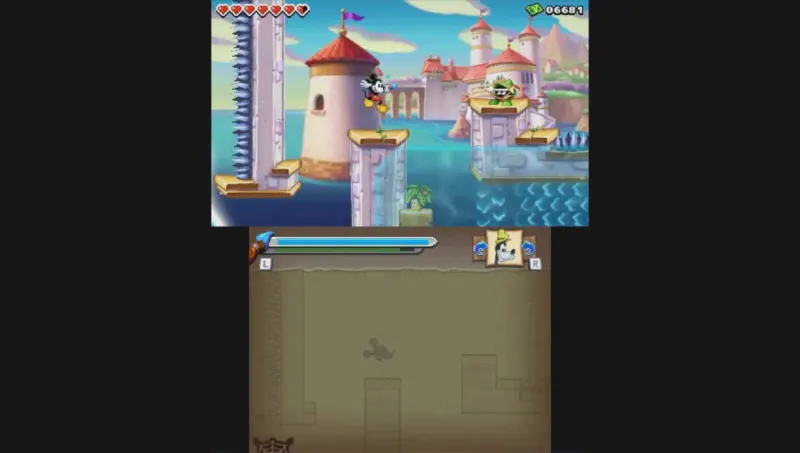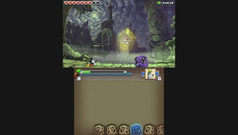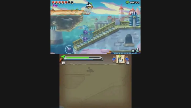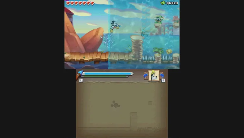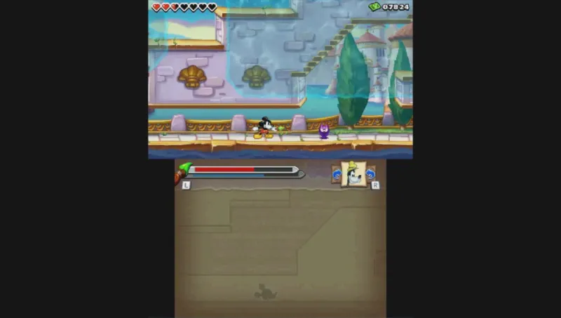 The main offender is the forced painting and thinning mechanic. At first, it’s not too offensive. You trace a drawing on the touch screen to make platforms and other objects appear in the top screen. Similarly, you can remove objects in the top screen by erasing images with the stylus. It soon becomes positively frustrating after you have to stop what you’re doing every 10 steps to doodle and then wait around while Mickey shoots paint or thinner to make the object appear/disappear. Imagine if you had to sketch in every barrel cannon in Donkey Kong Country before launching yourself around the level. Then, the cannons disappear after shooting you a couple times so you have to draw them in all over again. You can’t even choose where you place platforms or decide what shape they’ll take. There’s a pretense of creativity implied with painting that never rings true here.