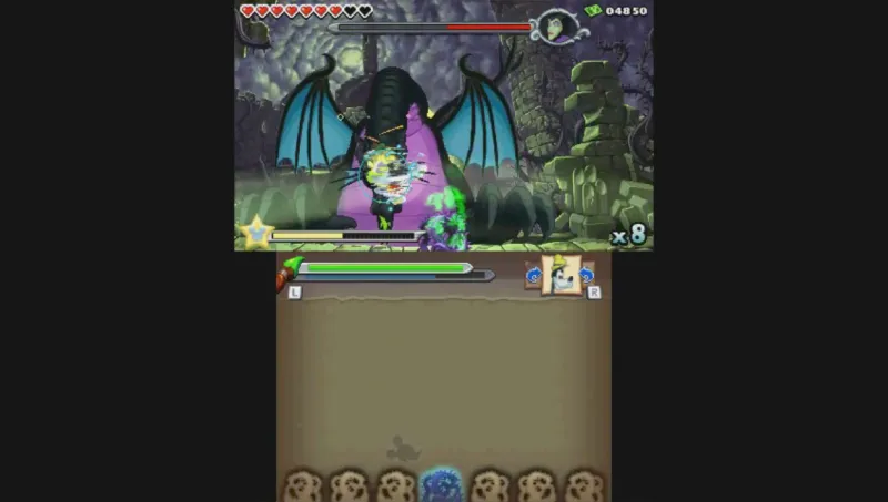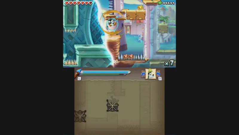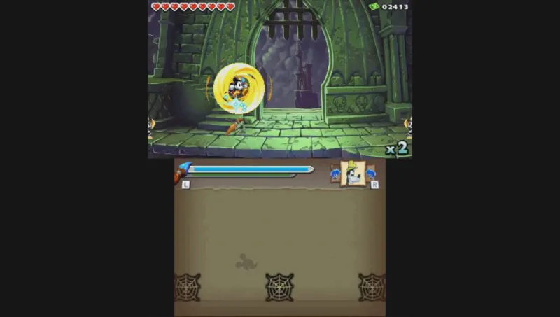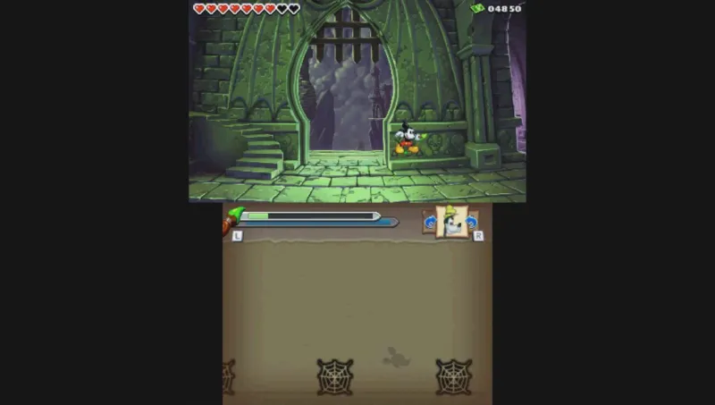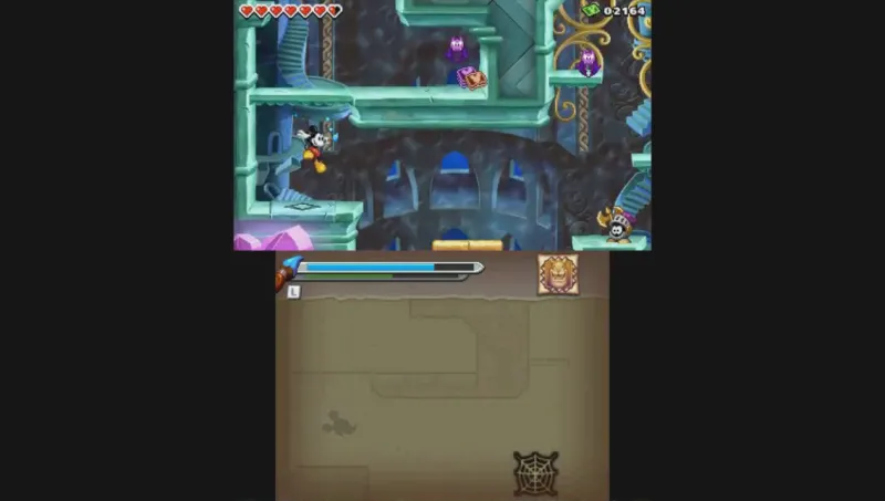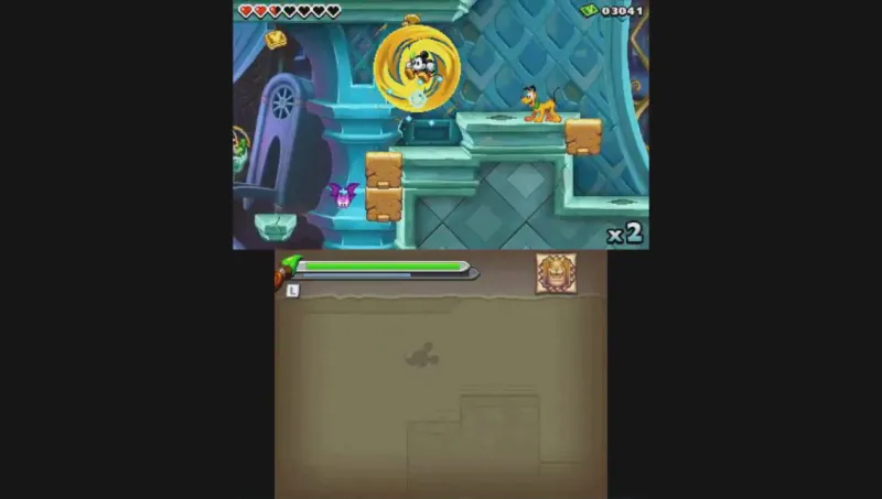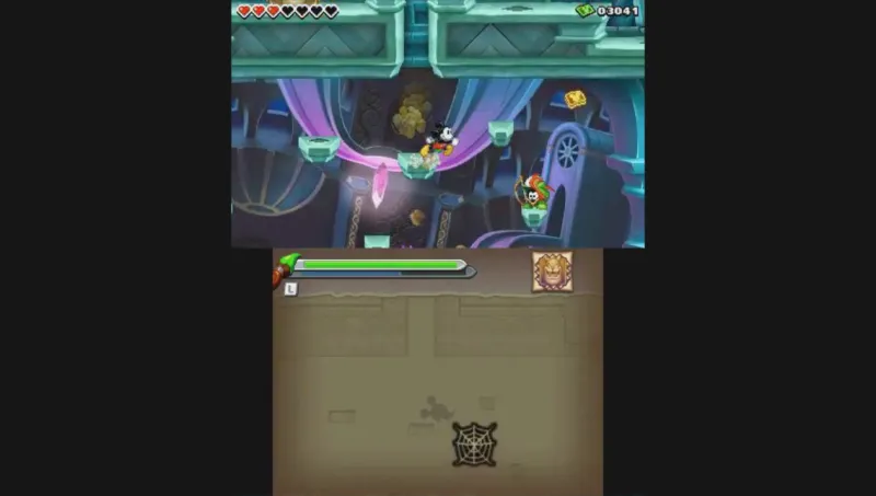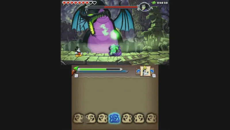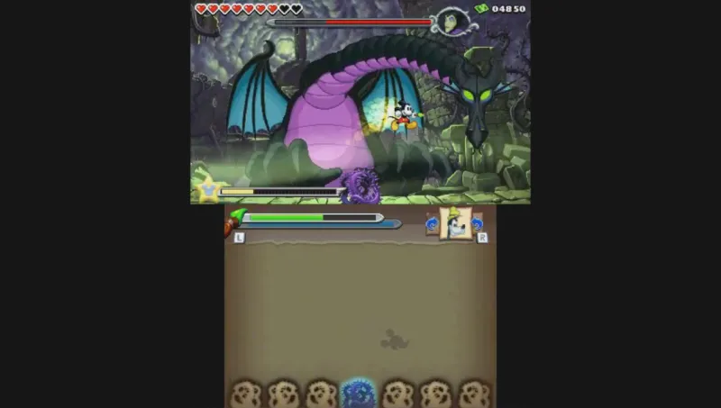 The main offender is the forced painting and thinning mechanic. At first, it’s not too offensive. You trace a drawing on the touch screen to make platforms and other objects appear in the top screen. Similarly, you can remove objects in the top screen by erasing images with the stylus. It soon becomes positively frustrating after you have to stop what you’re doing every 10 steps to doodle and then wait around while Mickey shoots paint or thinner to make the object appear/disappear. Imagine if you had to sketch in every barrel cannon in Donkey Kong Country before launching yourself around the level. Then, the cannons disappear after shooting you a couple times so you have to draw them in all over again. You can’t even choose where you place platforms or decide what shape they’ll take. There’s a pretense of creativity implied with painting that never rings true here.