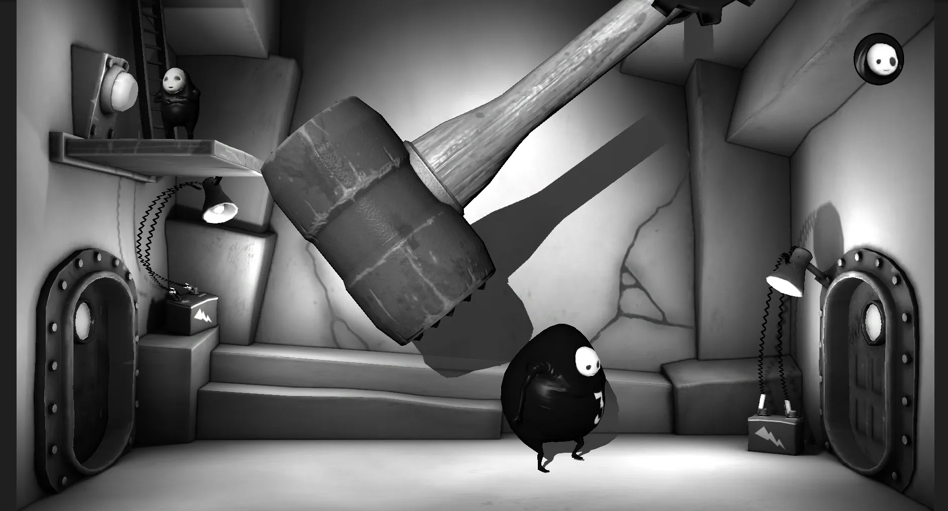 Along with frequent automatic death traps lining the walls, floors, and ceilings of the mysterious facility housing Lil and Laarg, minions sometimes operate some horrifying instruments of torture. In one room, I sent Lil moving forward only to stop him quickly (with a quick tap on the touchscreen) as an oversized mallet went crashing into the doorway that was my goal. A trickster minion above pulled a lever to bring the mallet back up, leaving a window just long enough for Lil to escape.