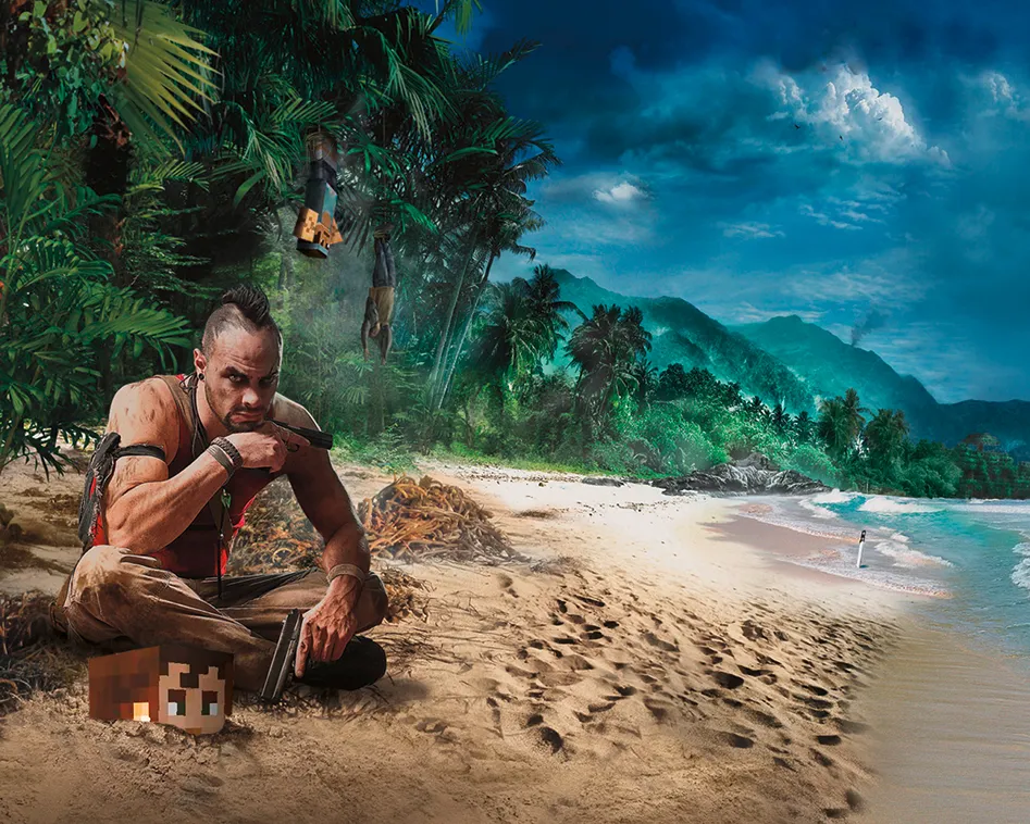 "This pack allows users to explore and survive the Minecraft experience through the warped lens of Far Cry 3, with modifications to all aspects of the original game, including environments, weapons and tools. Discover key Far Cry 3 locations and characters, including Vaas, Jason and Citra, all completely redesigned in Minecraft style. The map also features over 50 Easter Eggs, hidden throughout the Islands."