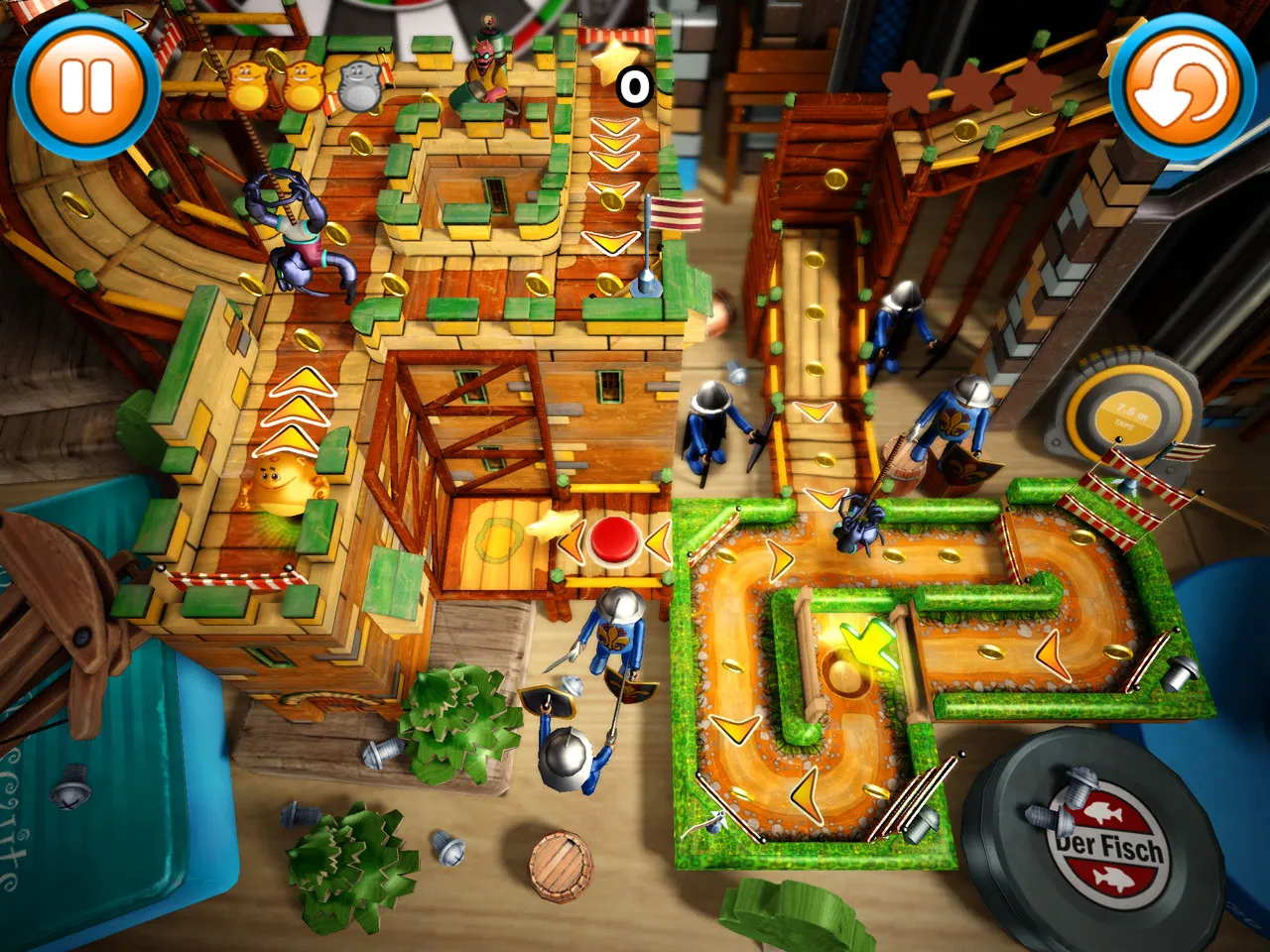 Fibble teams up with assorted aliens as players flick the little critter through a series of puzzling courses. You plot Fibble’s trajectory by touching the iPhone/iPad screen and dragging your finger in the opposite direction, winding up the critter for a big roll. The spherical Fibble then relies on momentum and several expertly placed speed boosts to hurtle him towards the goal, collecting coins and stars along the way. When Fibble runs out of steam, players can tilt their device to nudge him in the right direction. The basic controls feel intuitive and reliable. If you’ve played any other iPhone games of this ilk, you’ll definitely come into Fibble with the necessary skills to make it to the end.