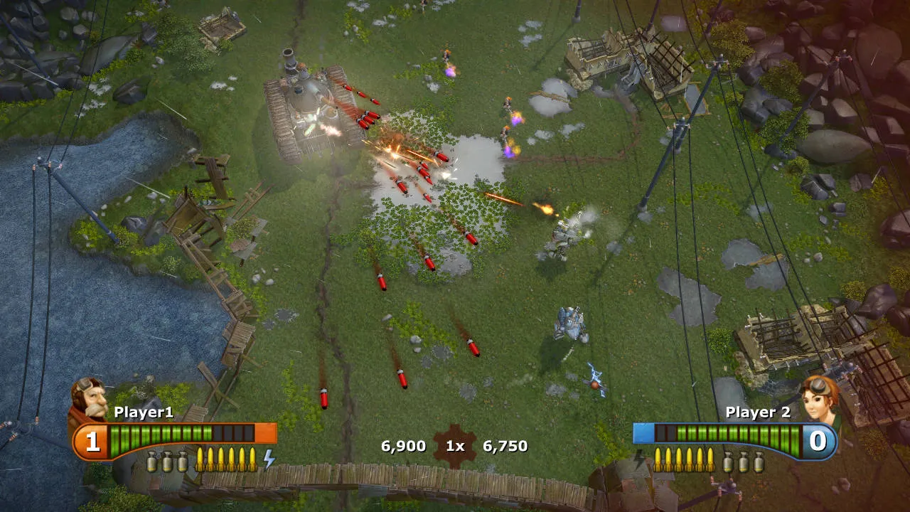 Enemies include infantry, tanks, flying bombers, and turrets, many of which would be cute if they weren’t trying to kill you. Clusters of red missiles constantly fill the screen, and it takes some finesse to tiptoe through the clear path. Bosses at the end of each chapter all provide a challenge and feature multiple imposing forms.