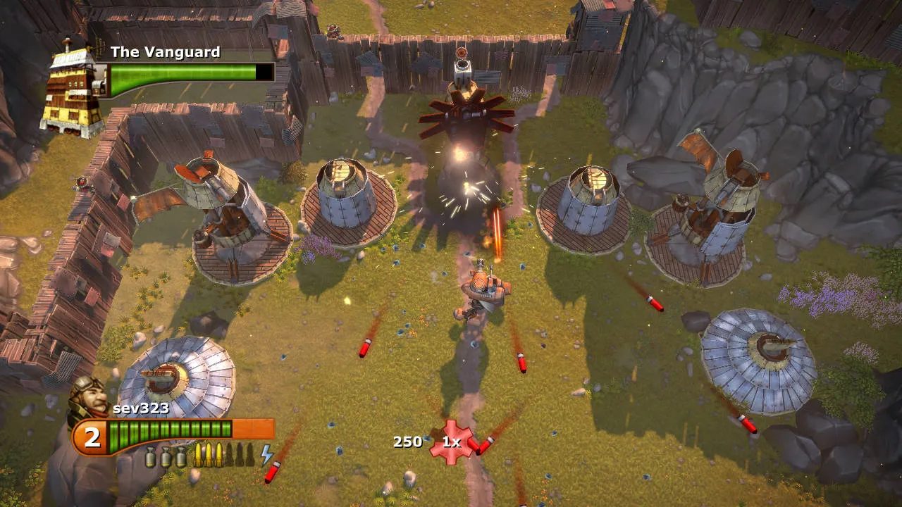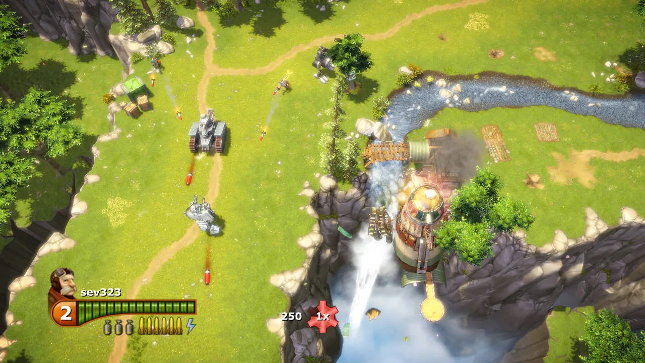The primary means of attack is a Gatling gun, of course. This blasts a wide spray, yet only has limited range, forcing players to get in close to deal damage. Rockets can stretch across the entire screen, though an ammo recharge timer prevents players from spamming the powerful shots. Grenades round out offense, but you have to stop to aim so I didn’t use them often considering all the enemy fire coming my way.