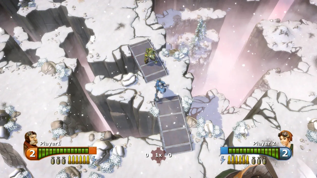 Throughout the course of the campaign, Max Brawley and optional co-op partner Zoe stomp their mechanical walkers through sunny forests, gloomy lightning storms, and treacherous snowy peaks in the name of stopping the evil Empire lead by his former army buddy.