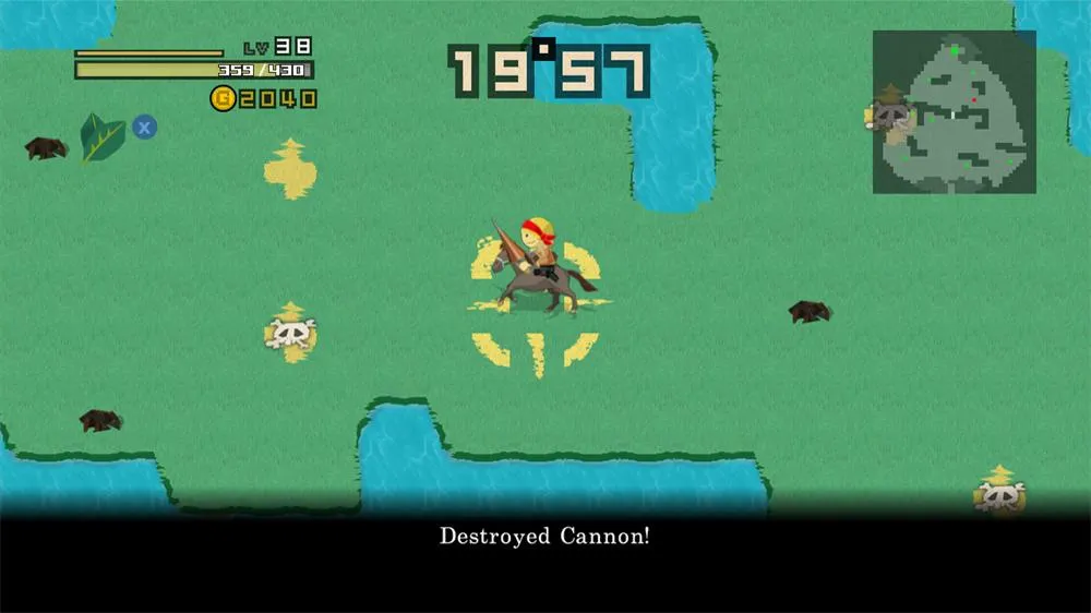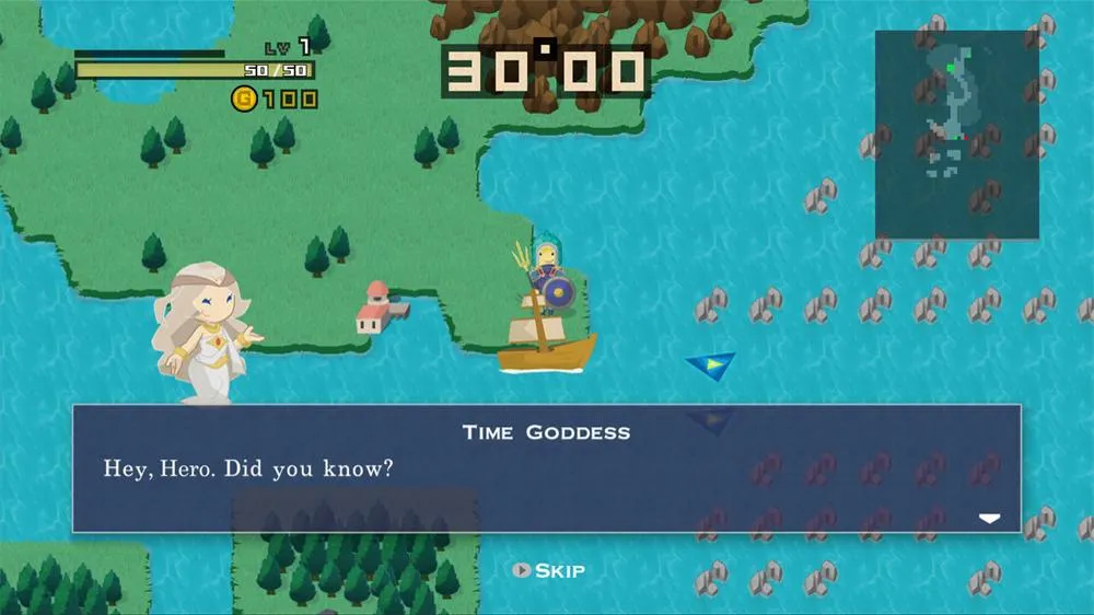 Hero 30, the first and bulkiest mode in Half-Minute Hero, follows the story of a plucky, young adventurer recruited by a cash-obsessed Time Goddess to help save the world. A mysterious evil force is traveling the globe one step ahead of the good guys, teaching evil lords a spell that will destroy the world in 30 seconds. The premise sounds goofy, but developer Marvelous Entertainment uses it to great effect, creating increasingly tense scenarios where the hero is required to explore the surrounding area, run quests for townspeople, and grind out levels to defeat the evil lord before the timer runs out. Battles are mostly mindless affairs where the main character rushes through enemy opponents without any direct input from the player; the real challenge is figuring out how to solve each scenario under the added stress of the timer.