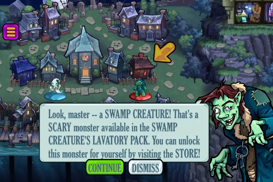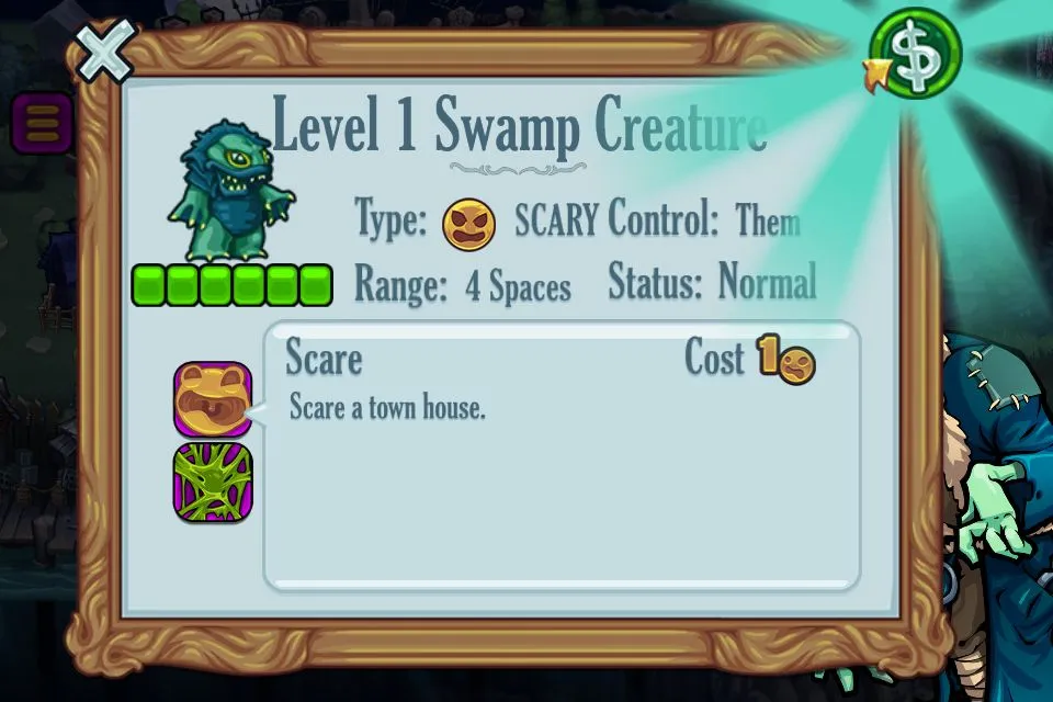 If you just want to enjoy the free experience, you have to stick to your boring-but-effective Frankenstein’s monsters, ghosts, and werewolves. These default monsters have basic scare, movement, and attack abilities. If you’re willing to pay real money (between $1.99 and $2.99 for assorted bundles), you can unlock special monsters to be included in your deck. You can also buy single-use items that increase attack power and take back claimed homes from your opponents.