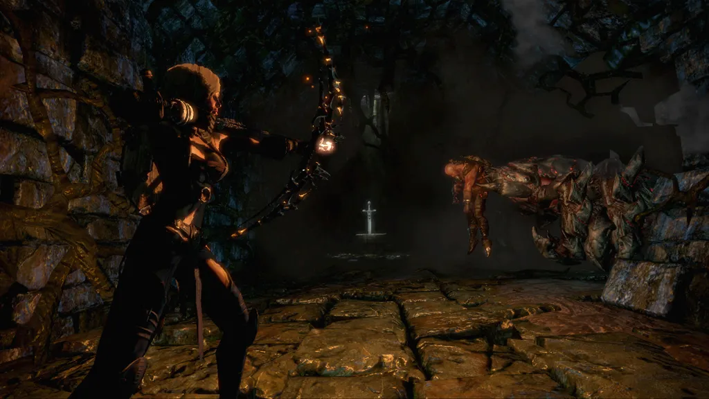 The spell effects are among the visual high points, though that’s largely a function of how drab the rest of the game is. I don’t expect to visit well-lit catacombs or monster lairs overflowing with color, but Hunted overdoses on earth tones. Graphical glitches are also commonplace. Some don’t do much aside from pulling you out of the experience, such as enemies floating in the air after dying or the dramatic bow finishing move freaking out at close range. Others are more troublesome. When I cleaned up loot from most major battles, items were almost always lurking beneath the ground beyond my reach. I knew they were there, thanks to the telltale shimmer, but I couldn’t pick them up. Those missed potions and elixirs can be critical, since you won’t encounter any stores to replenish your supplies.