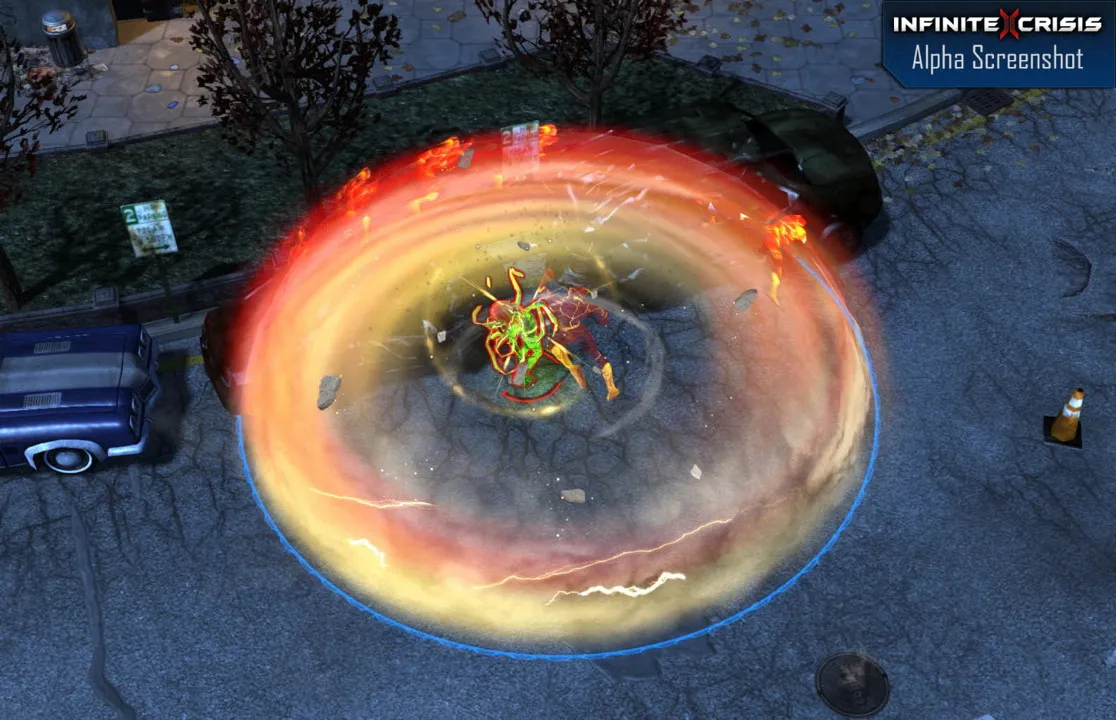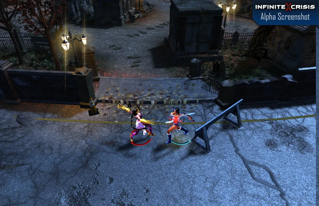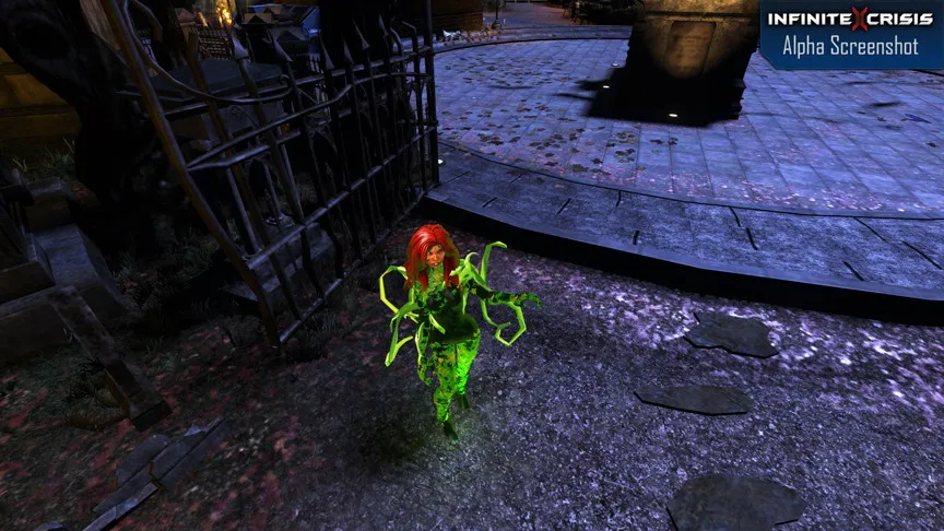 I got my hands on the latest build of Infinite Crisis on a map set in Gotham City. There are currently three maps planned to be included with the release of the game. The Gotham City map features a circular path enveloping a central park area, with team bases branching out the east and west sides. Cataclysmic events like a meteor strike can render sections of the map impassable, changing the flow of battle.