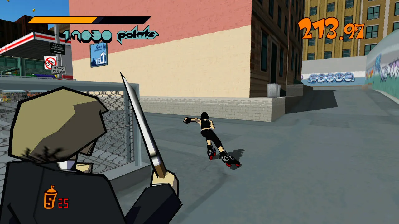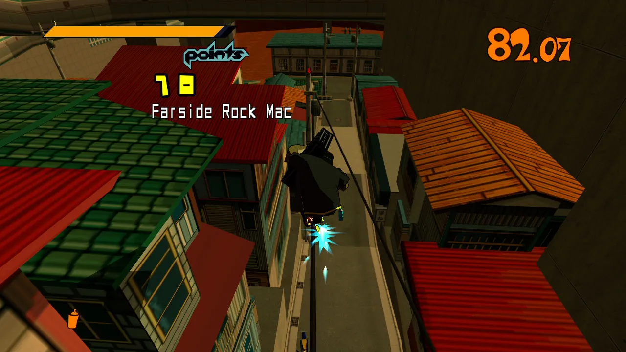 Sadly, Jet Set Radio’s gameplay is archaic and frustrating. Even at the time, the game paled in comparison to the Tony Hawk series. The impressive style, graphics, and sense of fun were enough to blind us. Today, it just feels poorly made. While the premise – explore the environment and tag graffiti spots – is solid, the moment-to-moment gameplay isn’t enjoyable. Your skater controls like a tank on ice skates. This lack of fine control is exacerbated by camera problems and the barely controlled chaos of the rampaging cops and urban traffic. Too often, you fall off a ledge just to be hit and carried off by a bus or run into an off-camera police officer. Grinding on rails is automatic, so you’re magnetically attached to the rail until you choose to jump off, which takes away the feeling daring and creativity that you get from coming up with lines in Tony Hawk. The graffiti tagging, which has you tracing movements with the analog stick, sometimes doesn’t register correctly, leaving you standing there as the police close in. The trick system is shallow and isn’t compelling in its own right.